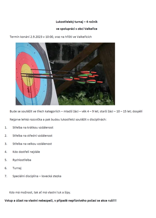 Dne 2.9.2023 od 10:00 proběhne na fotbalovém hřišti ve Valkeřicích 4. ročník "Lukostřeleckého turnaje". Všichni, kteří budou mít zájem se zúčastnit, jsou srdečně zváni. V případě nepříznivého počasí se akce ruší. Účast na vlastní odpovědnost.