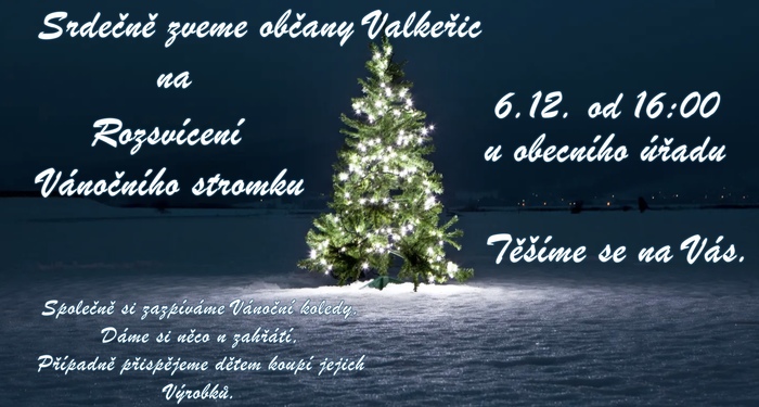 Obec Valkeřice zve všechny občany na rozsvícení Vánočního stromku, které proběhne 6.12.2024 od 16:00 u obecního úřadu. Využijte příležitosti sejít se v předvánočním čase a vidět se se sousedy nebo s lidmi, které nemáte čas v průběhu roku potkat.Poslechněte si koledy, zazpívejte si, dejte si něco na zahřátí. Budete -li chtít, přispějte koupí výrobků dětem do MŠ. Těšíme se na Vás.