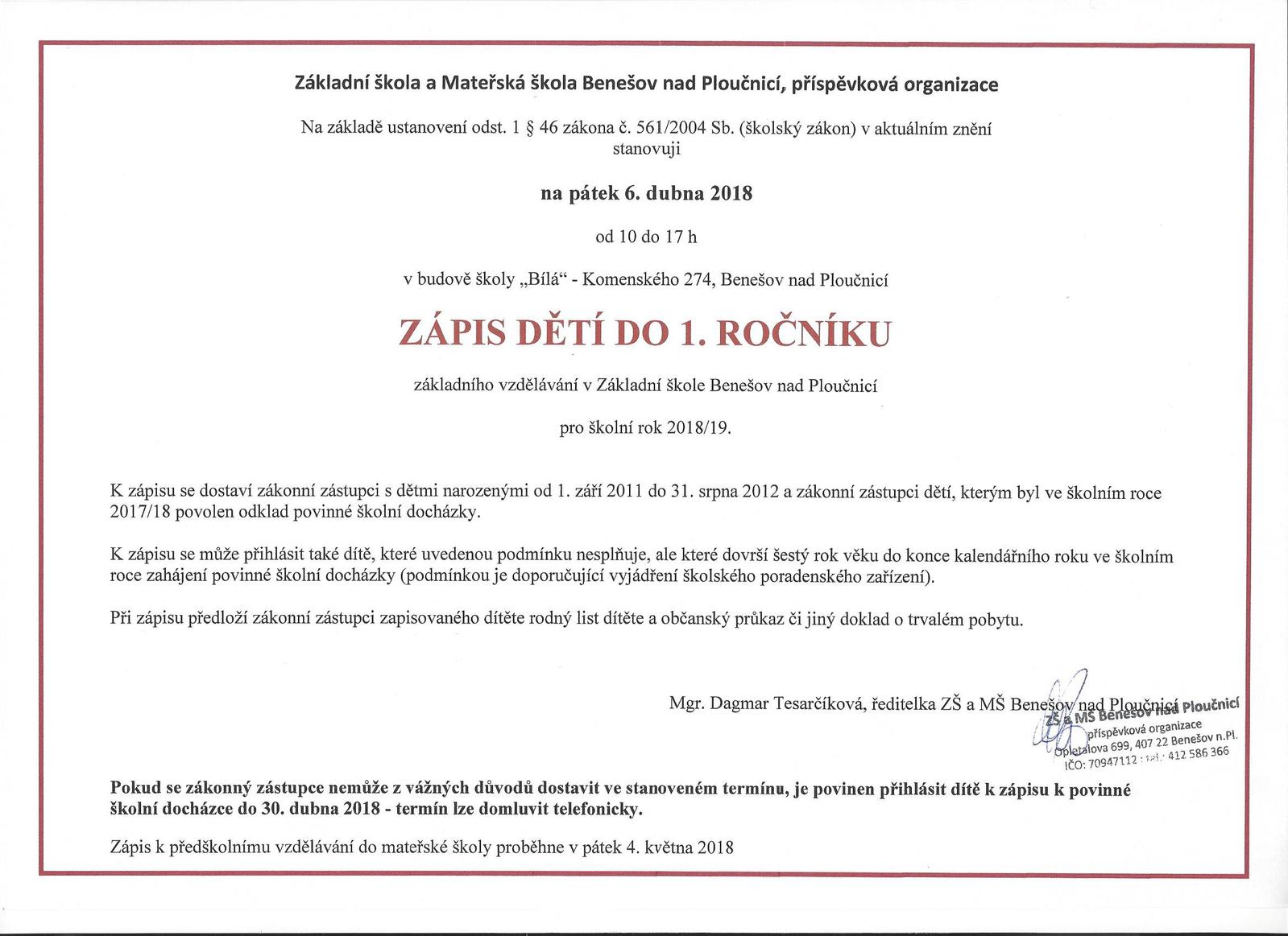 Úvod > Aktuality > Zápis do 1. třídy -ZŠ Benešov nad Ploučnicí